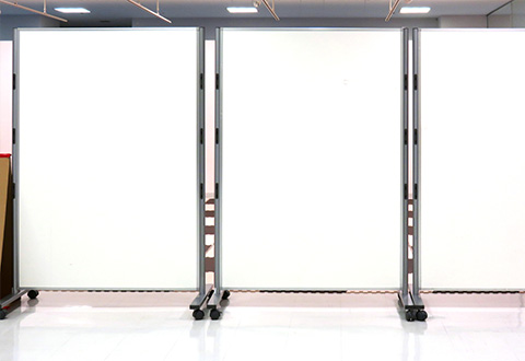 パーティションを壁や天井に取り付けるのではなく、目的や状況に応じて手軽に・早く・自由にレイアウトできるようにしたものが移動間仕切りです。